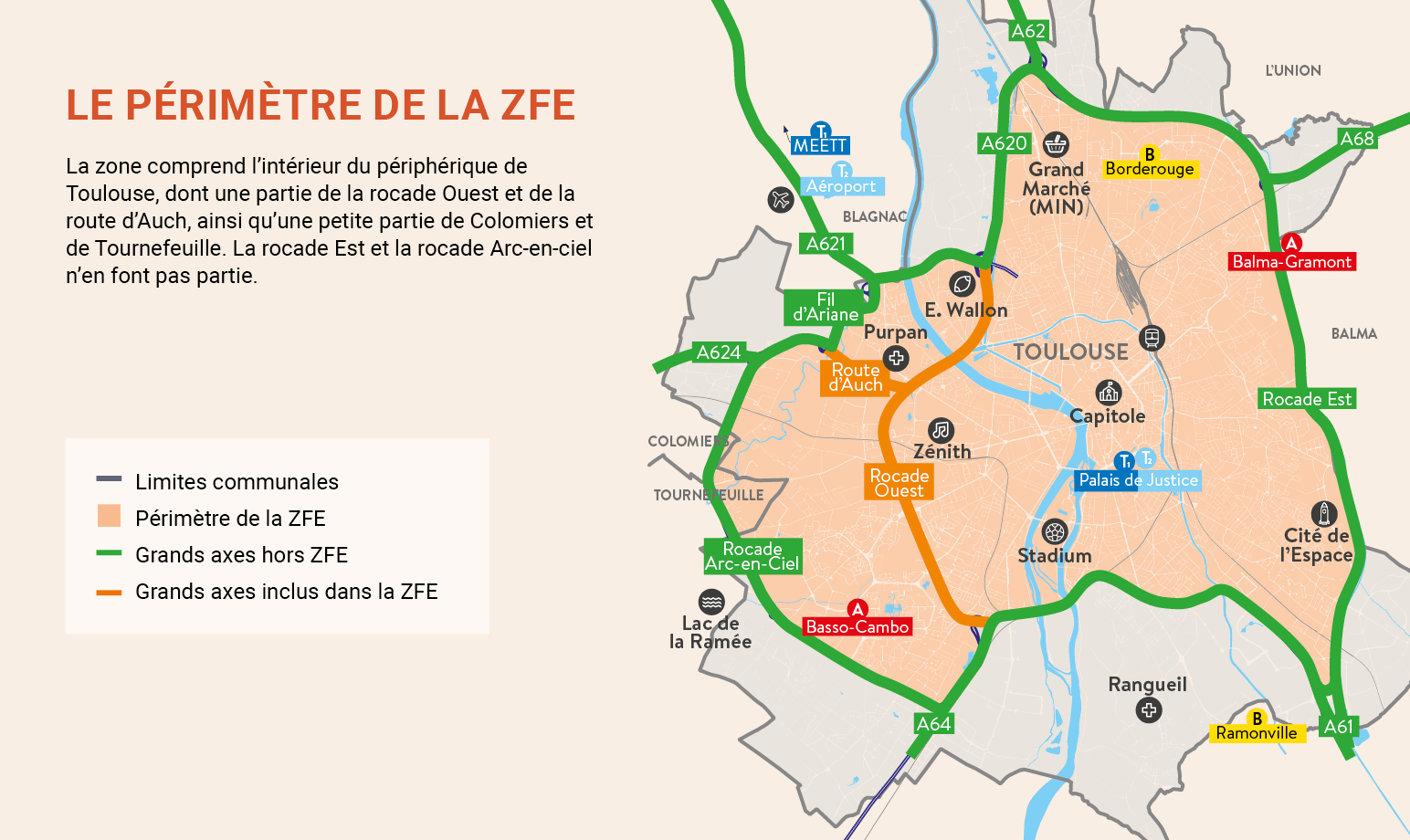 The low-emissions zone of Toulouse is bordered by the Périphérique ring road and covers most of the city’s territory. Highways A62, A61 and A620 are outside the zone.